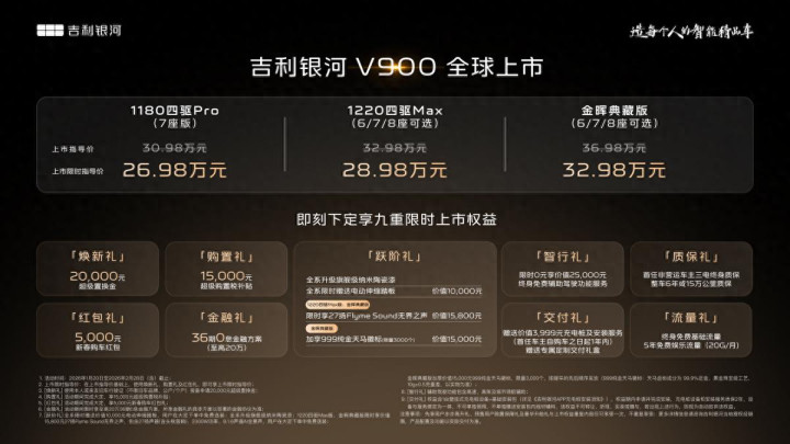 1月20日,吉利银河V900正式上市,本次新车共推出3个车型版本,其售价区间为30.98万—36.98万元,针对上市期间,目前新车限时指导价为26.98万—32.98万元。