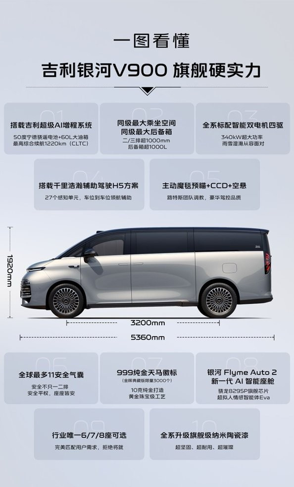 同时在细节位置,银河V900也进一步压缩了前舱的长度,这也让它的轴距占比更高,所以即便它的尺寸与竞品相差不大,但依然会让它看起来更有分量感,而且也能够提供更充裕的车内纵向空间,这也是它最大的优势。