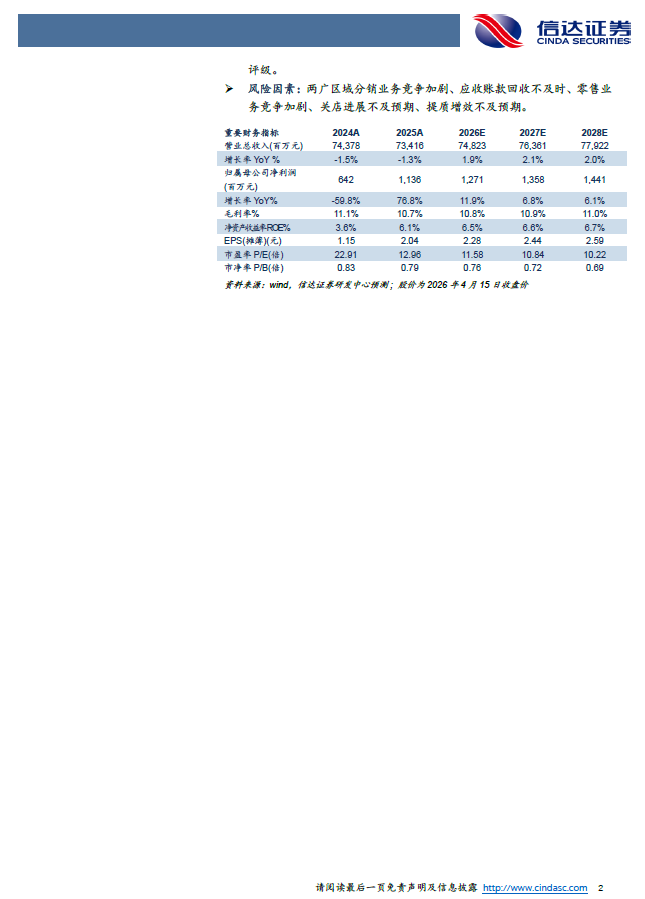风险成分:两广区域分销业务竞争加重、应收账款回收不足时、零卖业务竞争加重、关店进展不足预期、提质增效不足预期。