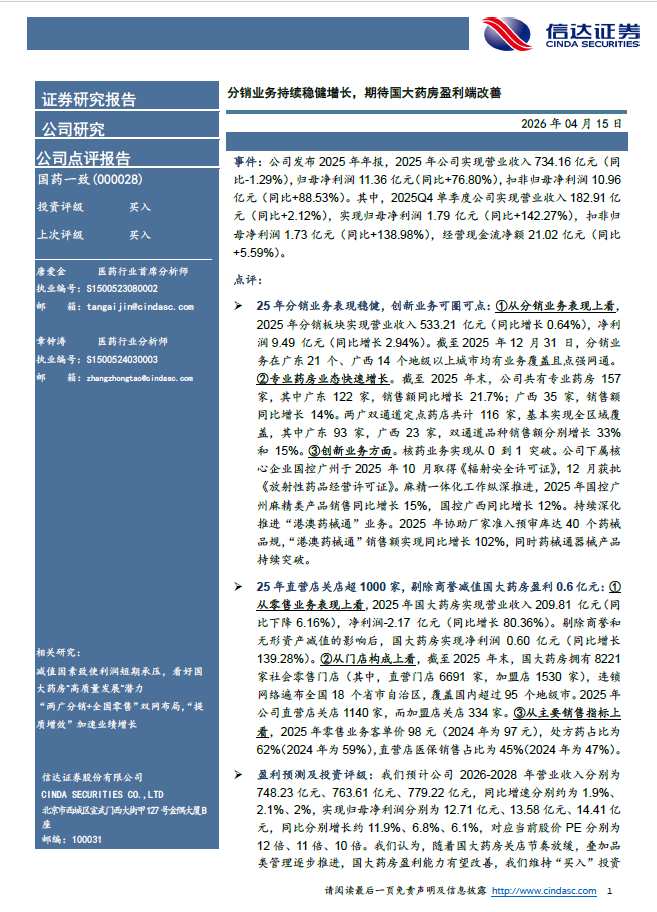 本文来自信达证券研发中心2026年4月15日发布的《国药一致(000028)点评禀报:分销业务抓续端庄增长,期待国大药房盈利端改善》,欲了解具体实质,请阅读禀报原文,唐爱金S1500523080002、章钟涛S1500524030003。