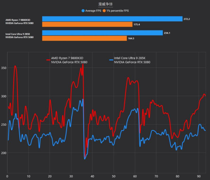 《漫威争锋》作为图形压力较大的FPS游戏,锐龙7 9800X3D同样交出了平均272.2 FPS、最低175.4 FPS的优异答卷。酷睿Ultra 9 285K的平均帧为234.1 FPS,虽然表现尚可,但在激烈的技能对拼场景下,1%最低帧会下探到164.5 FPS。两者的曲线虽然在部分时段交织,但整体波动幅度锐龙7 9800X3D要更小一些。其中部分曲线下滑是在切换测试场景。