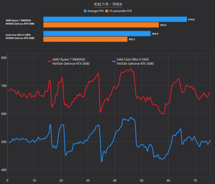 在《彩虹六号:围攻X》中,锐龙7 9800X3D依然保持着明显的优势,平均帧率达到674.6 FPS,大幅领先酷睿Ultra 9 285K的504.4 FPS。从帧率曲线上看,酷睿Ultra 9 285K的最高帧甚至很难触碰到锐龙7 9800X3D的最低帧区间,3D V-Cache大缓存对于这种需要频繁进行物理破碎计算的游戏逻辑有着显著的加速作用。