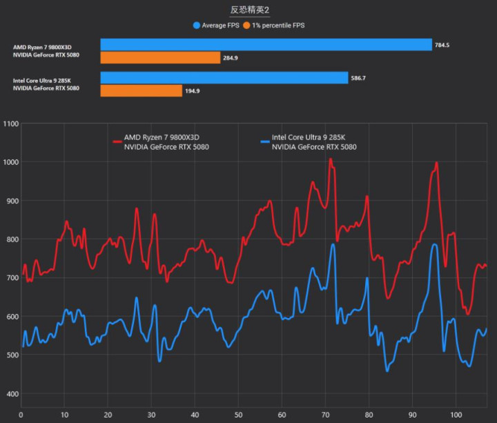 在CS2的测试中,锐龙7 9800X3D展现出了极其恐怖的统治力,平均帧率高达784.5 FPS,相比酷睿Ultra 9 285K的586.7 FPS领先幅度接近34%。更关键的是代表游戏流畅度底线的1% percentile FPS,锐龙7 9800X3D达到了284.9 FPS,而酷睿Ultra 9 285K仅为194.9 FPS。这意味着在激烈的烟雾弹交火或是快速拉枪时,AMD平台能提供更加稳健的画面输出。