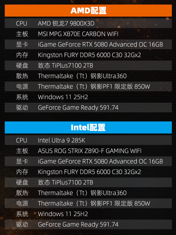 那么闲话少说,介绍一下我们的测试平台。为了充分发挥两款处理器的性能,我们选择了微星以及华硕的高端主板,从而避免因为供电性能不足出现降频,此外,为了尽可能公平对比,我们并未进行任何超频,仅解锁功耗墙。内存方面,由于目前内存大涨,手头仅有一套金士顿FURY 6000 C30 32GBx2套条,虽然并非高频,但依然在及格线之上,不会对测试成绩造成太大影响。显卡为七彩虹的iGame GeForce RTX 5080 Advanced OC 16GB,驱动程序为测试时最新的591.74,虽然英伟达官方已经加入DLSS 4.5的支持,但是我们并未手动启用新模型。