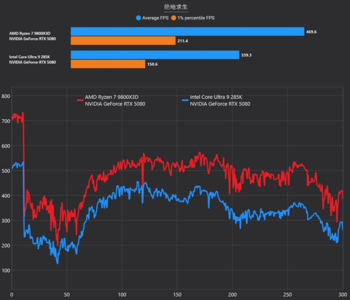 在吃鸡中,锐龙7 9800X3D再次展现了其针对内存敏感型游戏的优势。平均帧率469.6 FPS对比酷睿Ultra 9 285K的339.3 FPS,领先了近130帧。在吃鸡这种地形复杂、资源加载频繁的游戏中,96MB的大缓存能极大缓解数据读取压力,防止在进城或快速转场时出现瞬间卡顿。