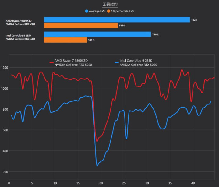 《无畏契约》是本次测试中最令人吃惊的项目,锐龙7 9800X3D直接跑出了平均1023 FPS的惊人成绩,成功突破了1000帧的大关。在1%最低帧方面,AMD更是以519.5 FPS对301.5 FPS形成了降维打击,领先幅度超过72%。对于追求极致响应速度的电竞选手来说,锐龙7 9800X3D配合高刷显示器简直是物理外挂般的存在。