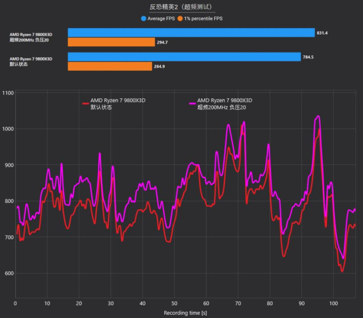 除了默认频率下的强势表现,锐龙7 9800X3D作为一款能够超频的X3D游戏神U,我们对其进行了PBO超频测试,设置超频200MHz并辅以负压20(Negative 20)。在《反恐精英2》的对比中,超频后的锐龙7 9800X3D平均帧率从784.5 FPS进一步飙升至831.4 FPS,性能提升幅度约6%,1%最低帧也同步上涨至294.7 FPS。这意味着即便已经站到了游戏处理器的巅峰,这颗神U依然保留了进一步向上挖掘的潜力,让玩家在极致流畅的基础上再上一个台阶。当然,如果你不擅长CPU超频,那么月末发布的锐龙7 9850X3D则在9800X3D的基础上提升了主频,默认状态下就可拥有更强的性能。