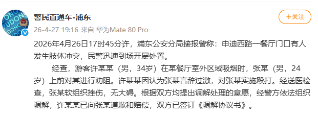 2026年4月26日17时45分许,浦东公本分局接报警称:申迪西路一餐厅门口有东谈主发生肢体突破,K8凯发中国官方网站民警速即到场开展防守。