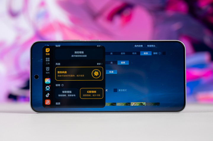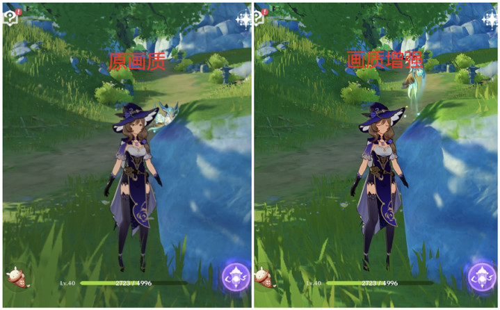 在压力更高的《原神》测试中,游戏内设置高画质,打开60fps,然后在游戏助手内打开画质增强,这时候游戏的画面分辨率得到了显著增强,画面观感更好。