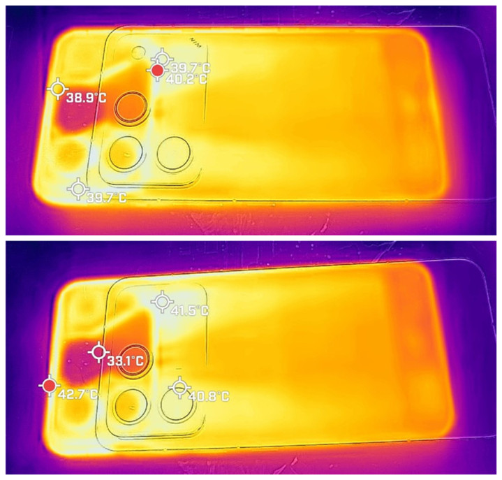 实测在室温28摄氏度的环境中,半小时《王者荣耀》后,手机背面最高温度仅有40.2℃,而在半小时《原神》游戏过后,手机背面最高温度也只有42.7℃。