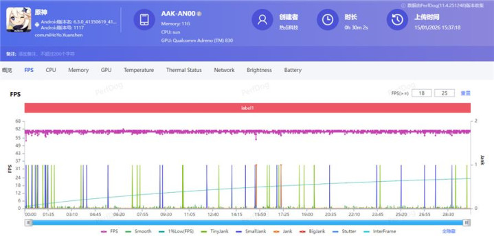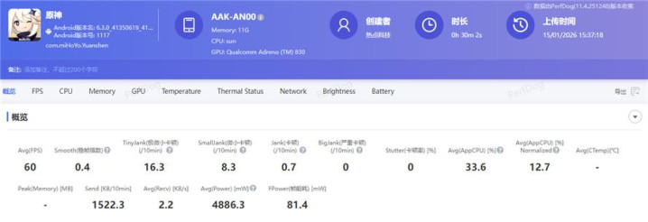 30分钟的《原神》跑图测试,荣耀WIN RT的平均帧率达到60fps,功耗则是4.88W,帧率全程也是比较稳定无明显卡顿。