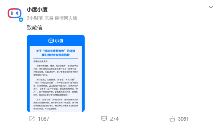 据新浪财经报道,2026年1月21日,百度旗下人工智能品牌“小度”通过官方微博发布致歉信,就2025年底“超能小度”大模型服务升级期间,部分智能音箱默认音色变更引发的用户不适,向广大用户正式表达歉意。