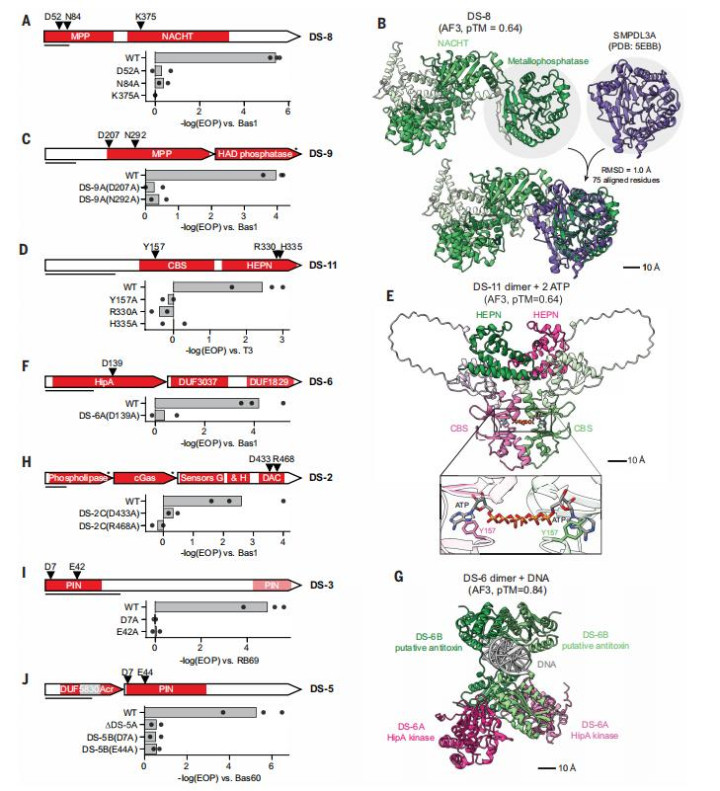 此外,有些系统用的卵白结构,往日从未在驻守中被考据过。比如一个叫 DS-8 的系统,它捎带的金属磷酸酶结构域跟东谈主类免疫系统中的某个卵白长得很像,东谈主类用阿谁卵白来调理自己的抗病毒信号通路。这阐扬细菌和东谈主类的免疫系统在进化上可能有着共同的陈腐根源。