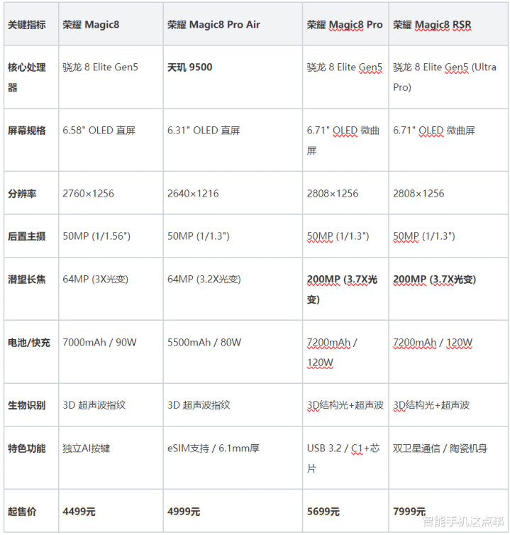 标准版Magic8守住了直屏+大电池的基本盘;Pro Air则是一次激进的工程挑战,在折叠屏级别的厚度里塞进了潜望长焦;Pro版和RSR则继续在影像和卫星通信上冲击天花板。