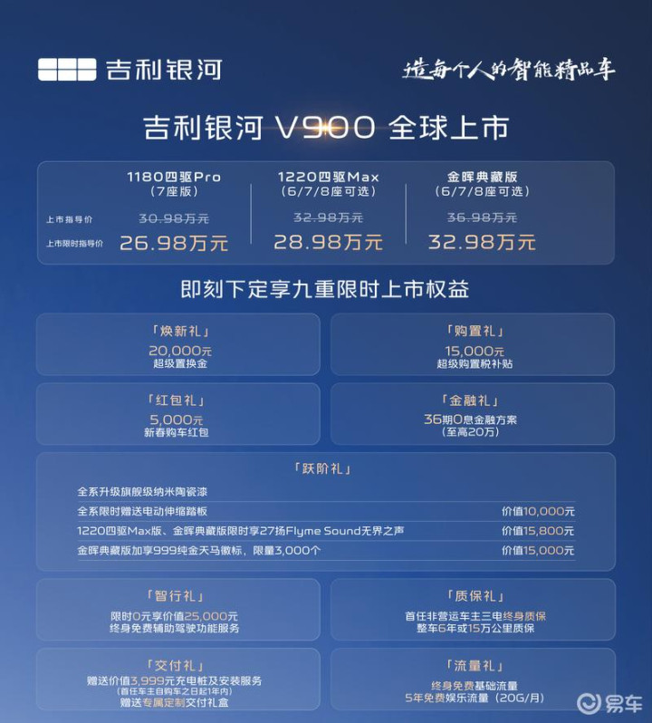 易车讯1月20日,吉利银河V900正式上市,包含三款车型,官方指导价区间30.98-36.98万元;上市限时指导价区间26.98-32.98万元。新车定位为大型MPV,车长超过5.3米,采用1.5T增程式动力。