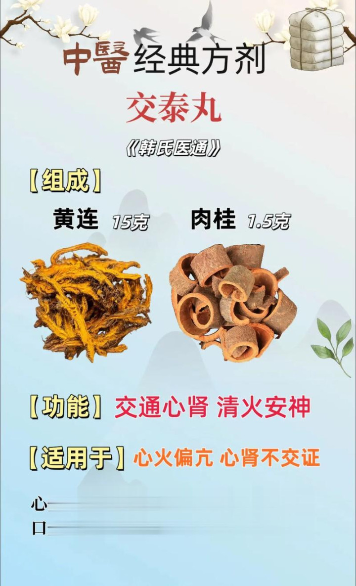 《韩氏医通》的经典小方,就两味药:黄连清心火,肉桂引火归元,把飘在上头的火气拉回肾里,水火既济,无论是入睡难已经早醒,齐能迟缓改善,药性和缓,顺应恒久保养。